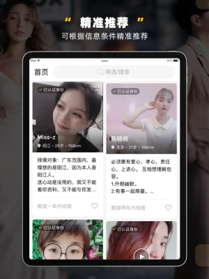 5. 高效匹配:当你完善个人资料后,系统会根据你的条件、爱好、恋爱观等特征高效地为你匹配和你属性相近的人。帮助你在共同爱好中找到最适合的那个Ta。
