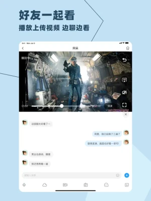 ·聊天内置小应用“一起看”,同屏同步播放,支持M3U8视频流。