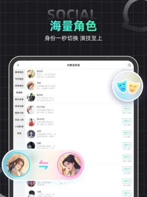 1、角色扮演系统:自由切换你想成为的角色,一个人可以扮演多个角色,同一个角色由多个人扮演。