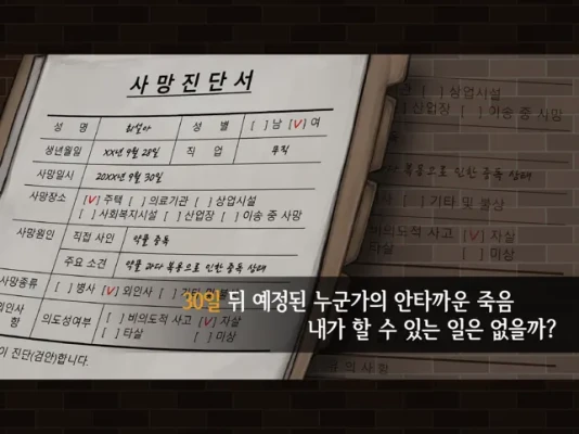 ■ 게임 소개 ■게임 「30일」은 자살 예방을 소재로 한 멀티 엔딩 스토리 어드벤처 게임입니다.게임을 시작하면 30일 뒤 ‘최설아’의 죽음을 알리는 사망진단서가 나타납니다.당신은 주어진 30일 동안 설아가 거주하는 로얄고시원의 총무로 플레이하면서, 죽음과 관련된 단서를 찾고 다양한 선택지를 마주하게 됩니다.하루하루 스토리를 진행하며 사망진단서에 예정된 설아의 죽음을 바꿀 수 있습니다.