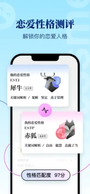 用户认证、性格测评、丰富的个人资料展示、划卡匹配、聊天互动是构成整个产品的基本组成部分。平台禁止未成年人注册下载使用。