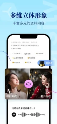 丰富、立体的个人主页:展现独特魅力,恋爱不再像筛简历,个人页使用形象照、基础信息、照片故事、语音问答、文字问答、AB面(一组反差的用户照片,例如小时候的我&现在的我)等模块信息,多维度的媒介信息展示更加丰富,立体的用户形象。打造有吸引力的用户交友名片。