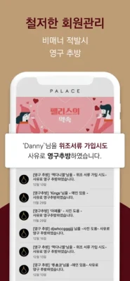 팰리스는 회원분들의 건전하고 즐거운 만남을 진심으로 기원합니다. 회원분들이 안심하고 만날 수 있도록, 비매너 회원을 강력하게 처벌하고 있습니다. 비매너 행위가 적발될 경우 해당 회원을 영구 추방함은 물론이고, 해당 회원을 비매너 게시판에 기록하고 해당 회원과 매칭된적이 있는 모든 회원에게 알림을 보내드립니다.