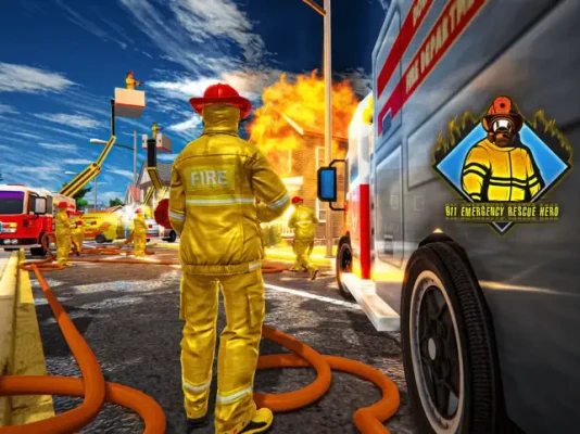 911 emergency ambulance game in which fire fighters rush to rescue in case of emergency. Fire extinguisher truck driver rescue to control emergency fire.