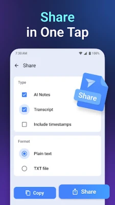 Share and Copy: Effortlessly share your transcriptions or copy them for use in other applications.