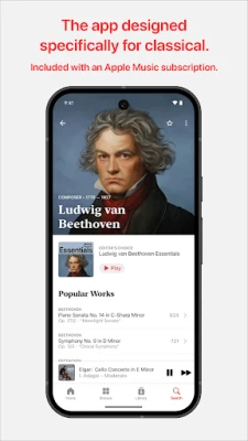 Get the app designed specifically for classical music. Available to Apple Music subscribers at no additional cost. Instantly find any recording in the world’s largest classical music catalog with search built for the genre. Enjoy the highest audio quality available (up to 24-bit/192 kHz Hi-Res Lossless) and hear classical favorites like never before in Spatial Audio—all with zero ads.