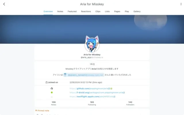 Aria is a client app for Misskey, a federated social media platform.