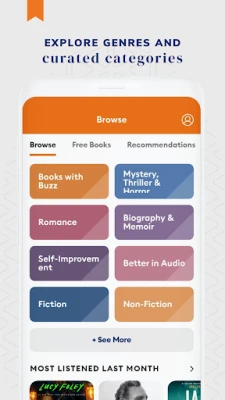 Discover our catalog by exploring top genres and featured booklists. We're constantly curating selections of member favorites, trending topics, TV/Film adaptations, and more. We’ll even give you a list of perfect first listens to start with.