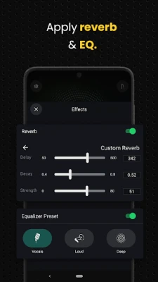 Enhance the richness and depth of your recordings with advanced settings like reverb and equalizer adjustments. Shape and mould your vocal performances with precision.