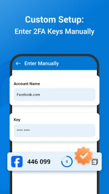 - Open the app, manually enter secret key or scan the QR code with the camera of your mobile phone.
