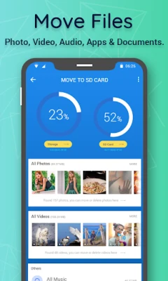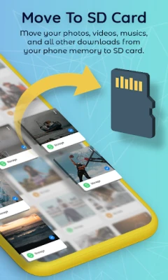 Get the all new and the most advanced Move To SD Card App which allows you to Move Files To SD Card as well as Move App To SD Card. Move your Photos, Videos, Musics, Zip Files, and all Other Downloads from your Phone Memory to SD card. You no longer have to worry about low Internal Memory.