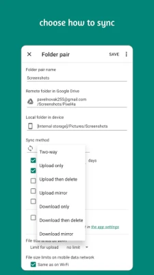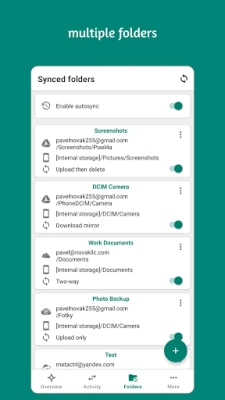 Autosync can be configured to do automatic file sharing between your devices, to back up selected folders in your phone to your cloud storage, or to make backup copies of important document folders in your cloud storage and save them in your device for offline use. These are a few examples of what you can accomplish with automatic file sync.