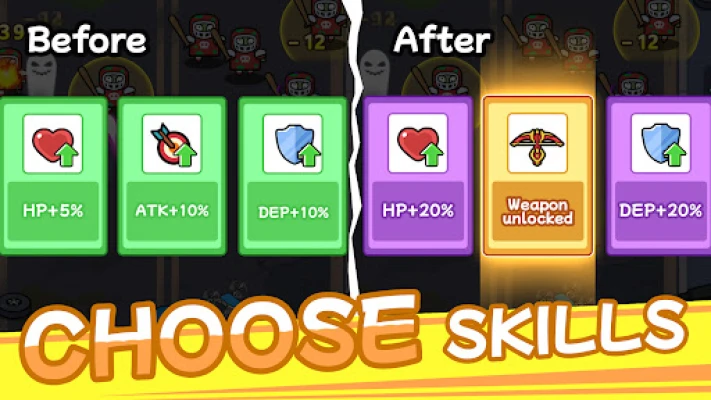 Skills appear randomly during combat. Players can choose one of three skills at a time.Good choices make the battle easier