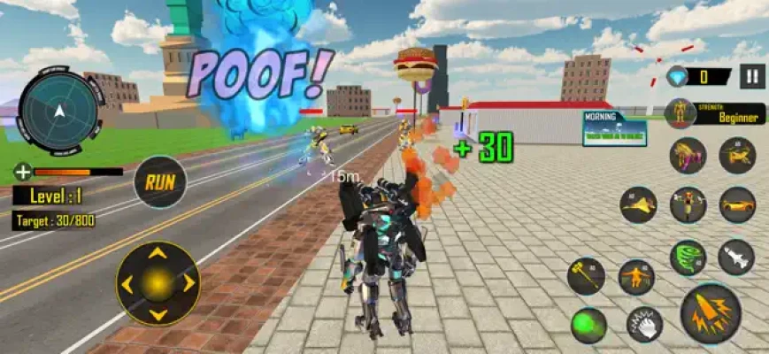 Enjoy futuristic robot war in a new bee robot game where you will enjoy robot transformations into bee robots and cars. This bee robot game encloses a lot of challenging missions to fight against evil robots and AI-driven shooting cars roaming in the city. You have to tackle the war against enemy drones and spaceships as well. Mini-map will help you locate your targets. Pickup gems to unlock exciting robot powers. Health pickup will increase your robot life. Let’s practice your shooting skills and level up your strength in this robot game.