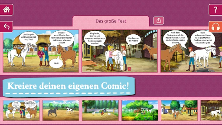Erfinde deine eigenen Comics mit Bibi und Tina, speichere diese, drucke sie aus oder versende die Geschichten an deine Pferde-Freundinnen! An allen Orten auf dem Martinshof kannst du Bilder erstellen, aus welchen du anschließend einen Comic basteln kannst. Dazu stehen dir verschiedene Figuren, Pferde, Tiere und Gegenstände zur Verfügung.