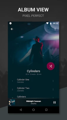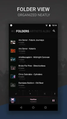 You can tweak the design to your liking with the powerful settings available. Swipe in the middle of the screen to navigate between the pages. Tap on the top titles for additional options. The mp3 music player keeps tracks of your most played Artists and Albums giving you a smart startpage called 'Play Now' with suggestions what to play.
