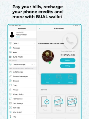 • BUAL is a VoIP application dialer which is created using the latest mobile telecommunication technologies• We combine a few features which will make BUAL as a ONE STOP communication app between you and your family and friends.• BUAL service will work on WiFi and Mobile Data connection. • FREE peer to peer call to any BUAL user worldwide. • FREE video call to any BUAL user worldwide. • Chat to any BUAL user worldwide. You can send file, text, image and video. • Cheap domestic and international phone call to any fixed line or mobile worldwide. • Credit balance transfer to any BUAL user worldwide. • Share BUAL Top Up with more than 400 mobile operators worldwide