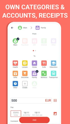 The app supports multiple currencies: you can add transactions in various currencies - for instance, when on vacation abroad, in case of income in a foreign currency or purchases in a different country. Built-in calculator will automatically update the exchange rate and make all necessary calculations.