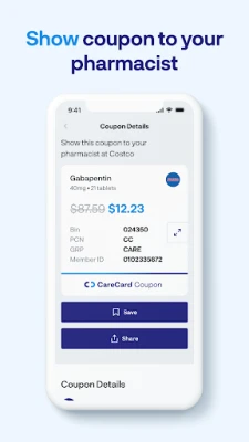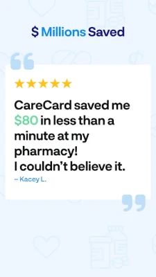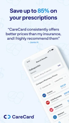 Save up to 85% on prescriptions at your local pharmacy with CareCard's prescription discount card and pharmacy coupons. No insurance is required. Search and compare actual drug prices at over 80,000 pharmacies nationwide in just one place with CardCard's mobile app. Get instant savings coupons to use at CVS, Walgreens, Rite Aid, Walmart, Kroger, Duane Reade, Tom Thumb, Albertsons, Publix, Costco, and many more! CareCard prescription prices are often lower than insurance copays. Use CareCard today regardless of your insurance or Medicare status.