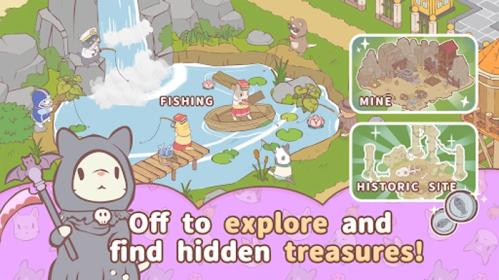 Take your cats on adventures to place like valleys, ponds, and mines!
