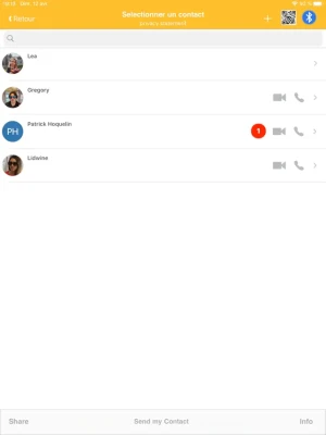 This App allows you to add contacts through the sharing of a so called 'public key' over the internet and bluetooth.