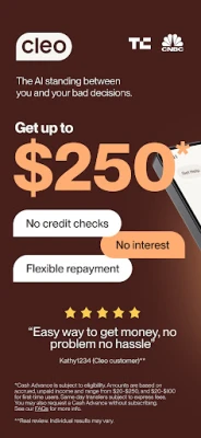 Cleo is not affiliated with Moneylion, Credit Karma, Kikoff, Experian Credit Check, Credit One, Credit Strong, Intuit Credit Karma, Albert, Earnin, Dave Bank, Brigit, Chime, Klover, loan apps, FloatMe Cash Advances, Empower, Venmo, Branch paycheck loans, or Gerald payday credit loans app
