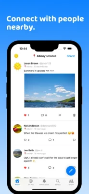 Wherever you go, Convo automatically updates your feed with posts from people in your current area. At home? Chat with neighbors and your local community. On vacation? Instantly connect with others at your destination!
