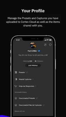 Benefits: Seamlessly send Presets, Neural Captures, and other items to your Quad Cortex. Manage your profile and items you have uploaded to Cortex Cloud. Browse & discover users. Share Presets & Neural Captures with your friends. Cortex Cloud requires you to have a free Neural DSP account and a registered Quad Cortex. Cortex Cloud is not required to use the Quad Cortex.