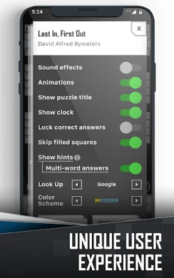 Game features: Smart Look Up, Dark Mode, Multi-word Entry Hints, Smart Step, Lock Completed Words, Incorrect Puzzle Assistance, Reveal Help, Show Errors, Clear Errors, Offline Mode, User Interface Themes.