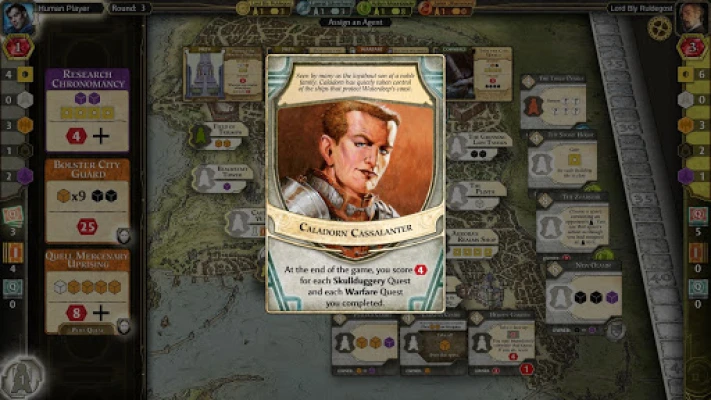 Lords of Waterdeep is a turn-based strategy game played in 8 rounds and can be played against AI or with up to 5 human players. Players take turns assigning their agents to do their bidding, whether it is to recruit new adventurers to their tavern or purchase a new building for the city. Points and resources are gained by completing quests, playing Intrigue cards, constructing new buildings or having other players utilize the buildings you have constructed. At the end of the 8 rounds bonus points are awarded and the player with the most points at the end wins the game.