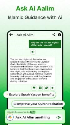 The built-in Ai Quran Assistant lets you explore the meaning of verses and find answers to Quran Majeed references instantly.