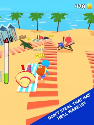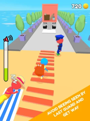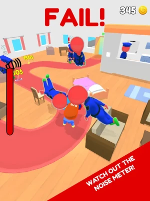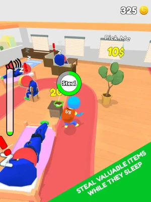 Steal the most valuable items to collect more money. - Don't steal items from stickmen's bodies cause they will wake up. - Don't step on animals because they will make noise. - Don't let the noise bar fill red because they will hear you.