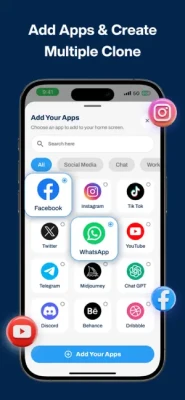 Clone apps like WhatsApp, Facebook, Instagram, Messenger, and more for dual applications.