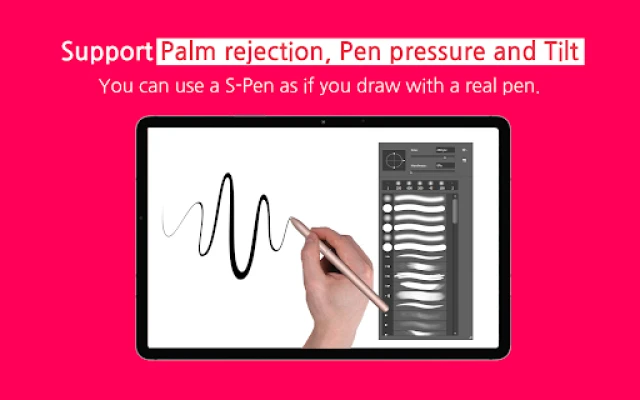 It fully supports "Palm Rejection", which allows you to draw with your palm on the screen, and "Pen Pressure" and "Tilt" of the S Pen.