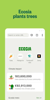 Ad blocker and fast browsing — The Ecosia app is based on Chromium and gives you an intuitive, fast and secure browsing experience with everything you need, including tabs, incognito mode, bookmarks, downloads and a built-in ad blocker. We also show a green leaf beside your results that are pro-environment, helping you make greener choices whilst you search.