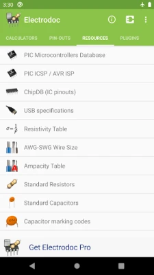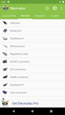 These are the extra calculators and pinouts available at the moment only in the PRO version: Lookup Resistor color by value, Zener Diode Calculator, Y-Δ Transformation, Decibel Converter, RMS Converter, Range Converter, Power Over Ethernet, VESA Connector, PC peripheral connectors, MIDI/Game port, Apple 30-pin connector, PDMI, Trailer connectors, SD card pin-out, SIM/Smart card, Raspberry Pi pin-out, LCD pin-out, GPIB/IEEE-488 pin-out, Thermocouples colors, Arduino boards, JTAG pinouts, BeagleBone boards, SMD Package Sizes, 7400 series IC, PT100 Conversion Table, Fuses color code, Automotive Fuses colors, DIN 47100 color coding, IP marking, World Plugs & Sockets, IEC Connectors, NEMA connectors.
