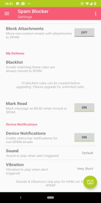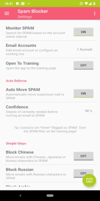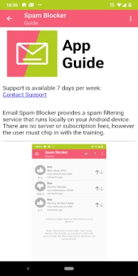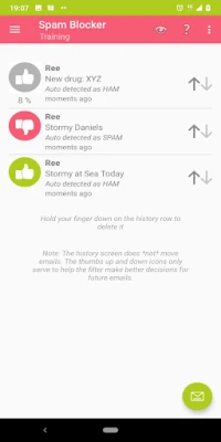 [Please note: The app does *not* auto remove email SPAM from the INBOX of Android email apps unless the INBOX is set to resync with the email SERVER. Also, be sure to choose an email SPAM folder on the account setup page! The auto detector requires USER training, pressing thumbs UP and DOWN icons on the email spam TRAINING page.]