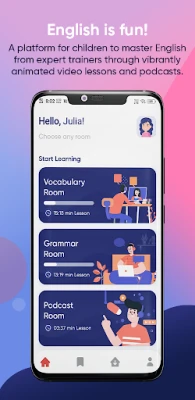 English House Junior App relies heavily on visual and auditory learning. Top-notch animated videos and podcasts help children to learn the language in a fun, entertaining way.
