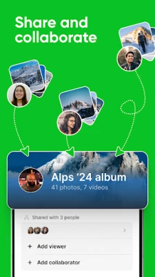 SHARE AND COLLABORATE: Let your family or friends add photos and videos to your albums. Everything, end-to-end encrypted.
