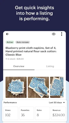-- Get key performance stats like views, sales, and revenue in a listing overview.
