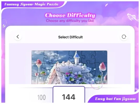 - Any jigsaw puzzle can be done at a variety of difficulties (36, 64, 100, 144, 225, or 400 pieces) .