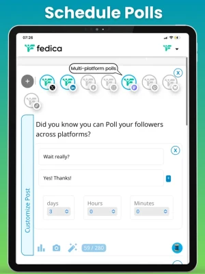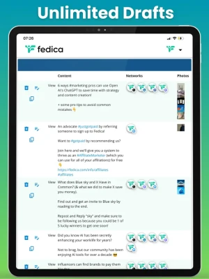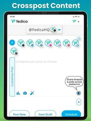 But Fedica isn't just about scheduling—it's about revolutionizing how you build your community. Schedule up to 10 posts simultaneously – each customized for every platform – and never miss an idea with unlimited drafts, knowing your content is perfected before its scheduled.