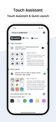 Floating Assistant including: assistive touch, floating clock and floating monitor. Assistive touch make it easier to quickly access your favorite apps, settings and quickly switch. It's also ideal for home and volume buttons that protect physical buttons. Floating Clock show the time clock and countdown timer in the floating window, help you to check the time when you are using other applications. Floating Monitor show the cpu temperature and usage percent.