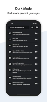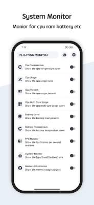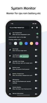 Floating Monitor show the cpu temperature, battery level, ram usage in the floating window. When you open the floating window you monitor the cpu, ram and battery status, It's very useful when you playing full-screen game.