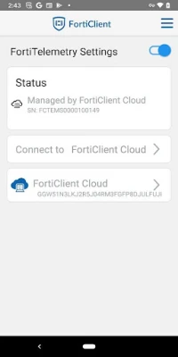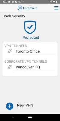 FortiClient - The Security Fabric Agent App provides endpoint security & visibility into the Fortinet fabric. It also allows you to securely connect your roaming mobile device to corporate network (over IPSEC or SSL VPN). Web Security feature helps protect your phone or tablet from malicious websites and unwanted web content. When using Virtual Private Network (VPN) connection between your Android device and FortiGate, all device traffic will be fully encrypted and sent over the secure tunnel.