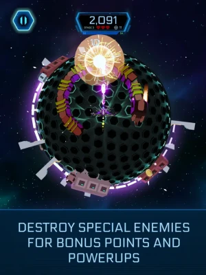 Navigate your spaceship around a mesmerizing sphere made of hexagonal pillars, all while an electrifying electronic soundtrack pumps through your speakers.