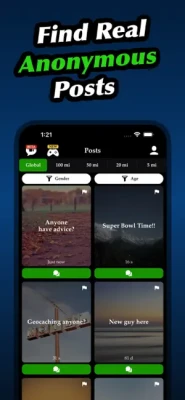 Connect with others who understand, all while maintaining complete anonymity on this social media platform. Global and Local Anonymous Connections. Connect anonymously with social people both globally and locally. Find posts by distance to find relevant conversations nearby, or explore thoughts and experiences from around the world. Further refine your anonymous connections by filtering by gender and age to find social relatable individuals anonymously with similar thoughts and experience it yourself. Express Yourself Anonymously in Many Ways. Customize your screen name to maintain your complete anonymity. Express and personalize your posts with custom fonts and text colors. Share and express your photos or choose from our image library to perfectly and express your thoughts. Engage and Express Thoughts in Diverse Anonymous Conversations.