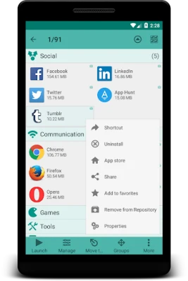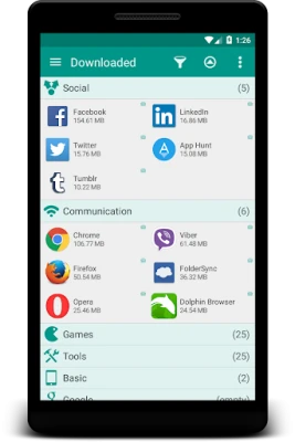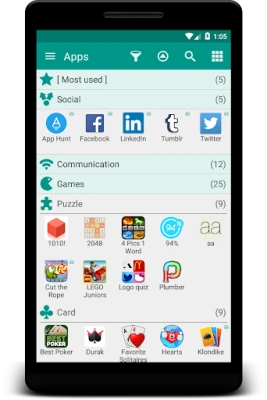 Organize your applications with auto-grouping to folders feature (folder organizer) which is based on Google Play categories. Newly installed applications can be categorized automatically. If you want to get more personalized structure, create your own folders or just rename predefined ones. It is possible to assign each application to several groups at the same time according to your needs. Use system folders to get quick access to most used, last used, or last installed apps.