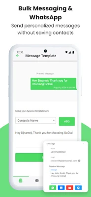 Send dynamic template messages via Email or Sms to your imported call lists. Or after a call without saving the number on your phone.