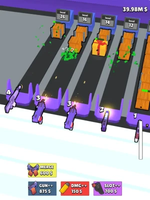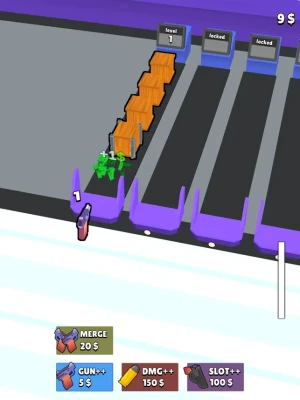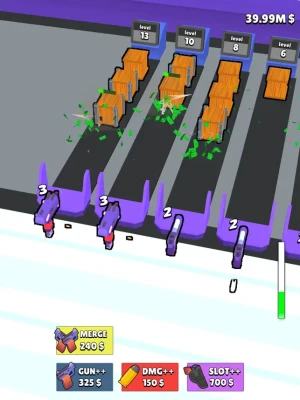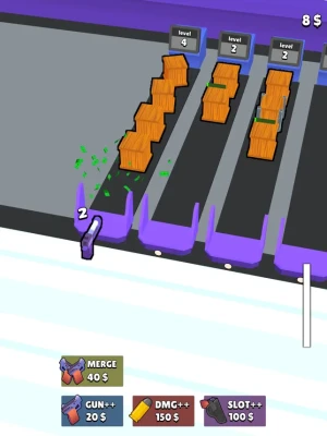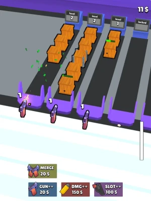 Unlock new slots and buy new guns to destroy them simultaneously. If you run out of slots, merge button can help you to unload some slots.